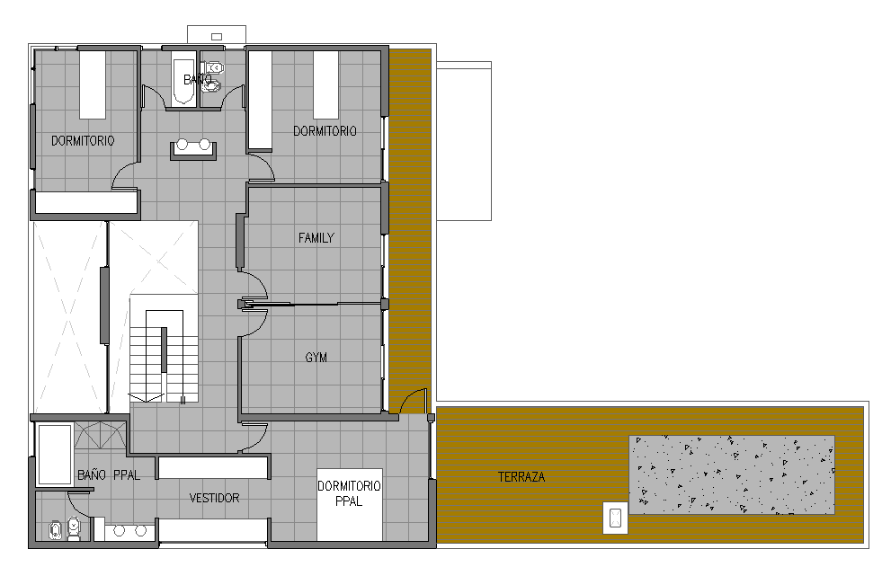 La propuesta de proyecto fue una casa con circulación vertical central, en dos plantas. En PB área pública, de reunión y juego, sector de servicio y despensa adosada para personal con cama adentro, un amplio quincho/parrilla integrado, playroom y gimnasio, un escritorio con entrada independiente para atender encargos laborales. En PA un sector bien marcado para los más chicos y una suite con mayor privacidad para los más grandes.
