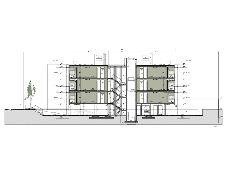 El edificio consta de cuatro pisos, incluyendo un subsuelo semi-soterrado dónde se ubican cocheras, esparcimiento y servicios pero a la vez hace de plano de acceso tanto peatonal como vehicular. En los otros tres pisos superiores se encuentran los seis departamentos, distribuidos en semipisos. Cada departamento es de tres ambientes e incluye: sala de estar, comedor, cocina, lavadero, dos dormitorios, dos baños completos (uno es suite) y balcón-terraza con parrilla individual, teniendo una distribución espacial muy funcional que se adapta perfectamente a las necesidades de una familia tipo y preferencias de los residentes urbanos.